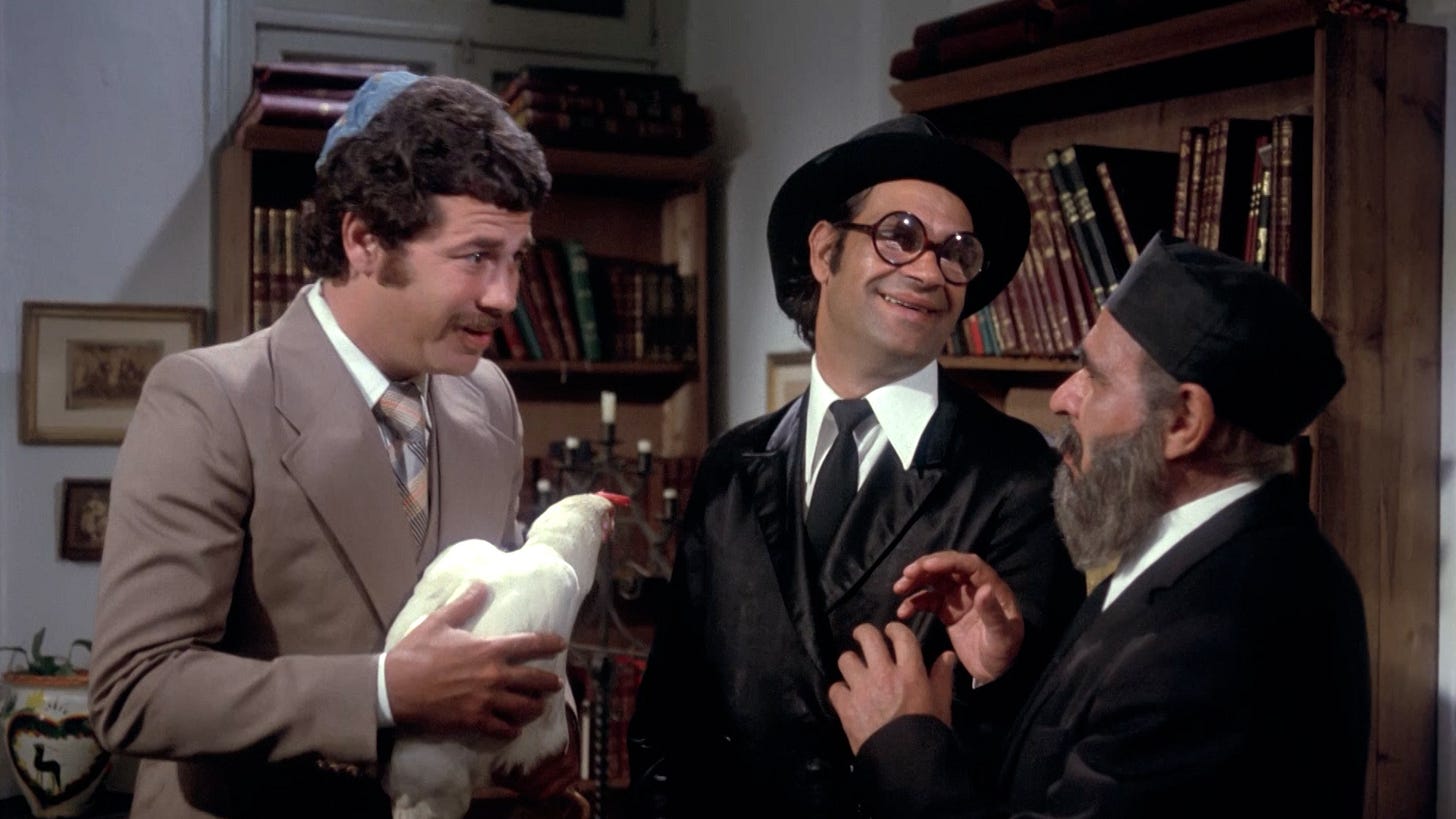 3. סצנת ההגעה של האורחים לבית הרב. האפקט הקומי אמנם נולד מהתסריט - הרי הרב לא מצפה לחכם חנוכה ולפמליה המוזרה שלו - אבל זאביק רווח כאן פשוט בשיאו. הבעות הפנים, הניואנסים הקטנים... מנהל עבודה שמשדרג בנוכחותו את כל האירוע. הלב יוצא אל הרב, שנקלע לסיטואציה, אבל הגוף מתפוצץ מצחוק.
